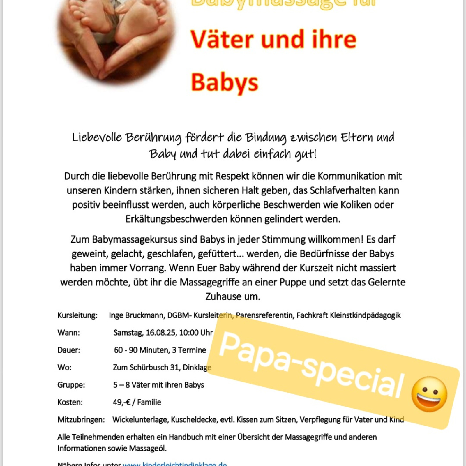 Auch die Babymassage liegt mir sehr am Herzen. Bei diesem Kursus nach den Richtlinien der Deutschen Gesellschaft für Babymassage darf ich Eltern begleiten und darin anleiten, die Signale und Bewusstseinszustände ihrer Babys zu erkennen und mit liebevoller Berührung die Bindung zu stärken.